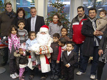 Wer sich also am 20.12.2011 um 15 Uhr ins Rathaus begeben hatte, konnte viele neugierige Kinderaugen bestaunen, die gespannt auf den Weihnachtsmann warteten. Der kam dann auch um kurz nach drei, und kurzfristig waren alle Kinder still und starrten ihn nur mit großen Augen an. Berührungsängste wurden schnell überwunden, und nachdem der Weihnachtsmann (unter dem Kostüm durfte der Referatsleiter des Standesamtes, Jochen Buff, schwitzen) die Kinder begrüßt hatte, ging es auch schon los. Frau Dahmen vom Integrationsrat gab die Geschenke an, die dann vom Weihnachtsmann überreicht wurden.