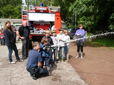 Mit mehreren ehrenamtlichen Helfern war auch die Senioren-Union (SU) wieder vor Ort. Ein besonders spannendes Abenteuer erlebten die Kinder beim Besuch der Freiwilligen Feuerwehr Monheim, die auf Einladung der SU Monheim den Abenteuerspielplatz besuchte. Der Leiterwagen und die Wasserspritze waren schnell in Kinderhand. Dann hieß es „Wasser marsch“ und „Ab mit der Drehleiter in die Höhe“. Dies war ein Riesenspaß für alle Kinder. Die Feuerwehr musste versprechen, im nächsten Jahr wieder auf dem Abenteuerspielplatz zu erscheinen.